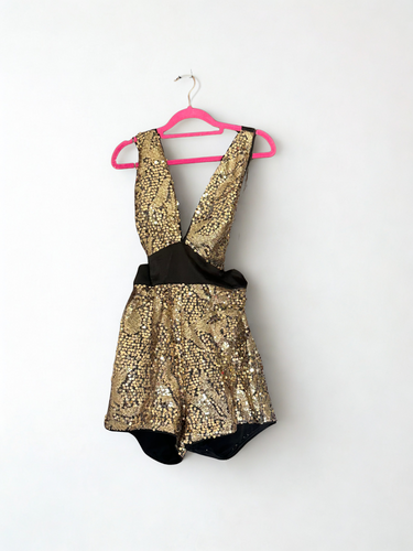 SHORT HALTER SHOWGIRL GOLD AND BLACK SEQUIN JUMPSUIT